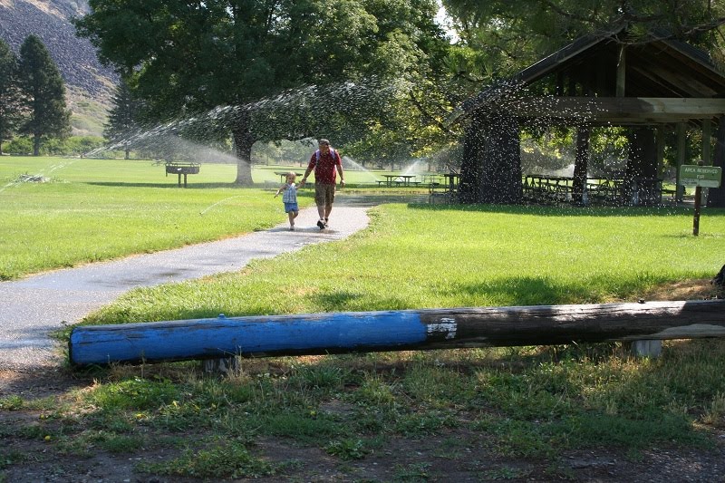 Not only was he willing to let her run through the sprinklers but he was willing to accompany her when she got a little scared about running that far away from us. If it would have just been me and my daughter and I had said "yes you can run through the sprinklers" but she was too scared I am sure that we would have been heading back to the car nice and dry because I would not have been willing to sit in wet jeans for the car ride. Luckily Daddy is willing to sacrifice comfort to bring his little girl's dreams to life (also willing to carry her Tinkerbell backpack). Here are some fun pictures.